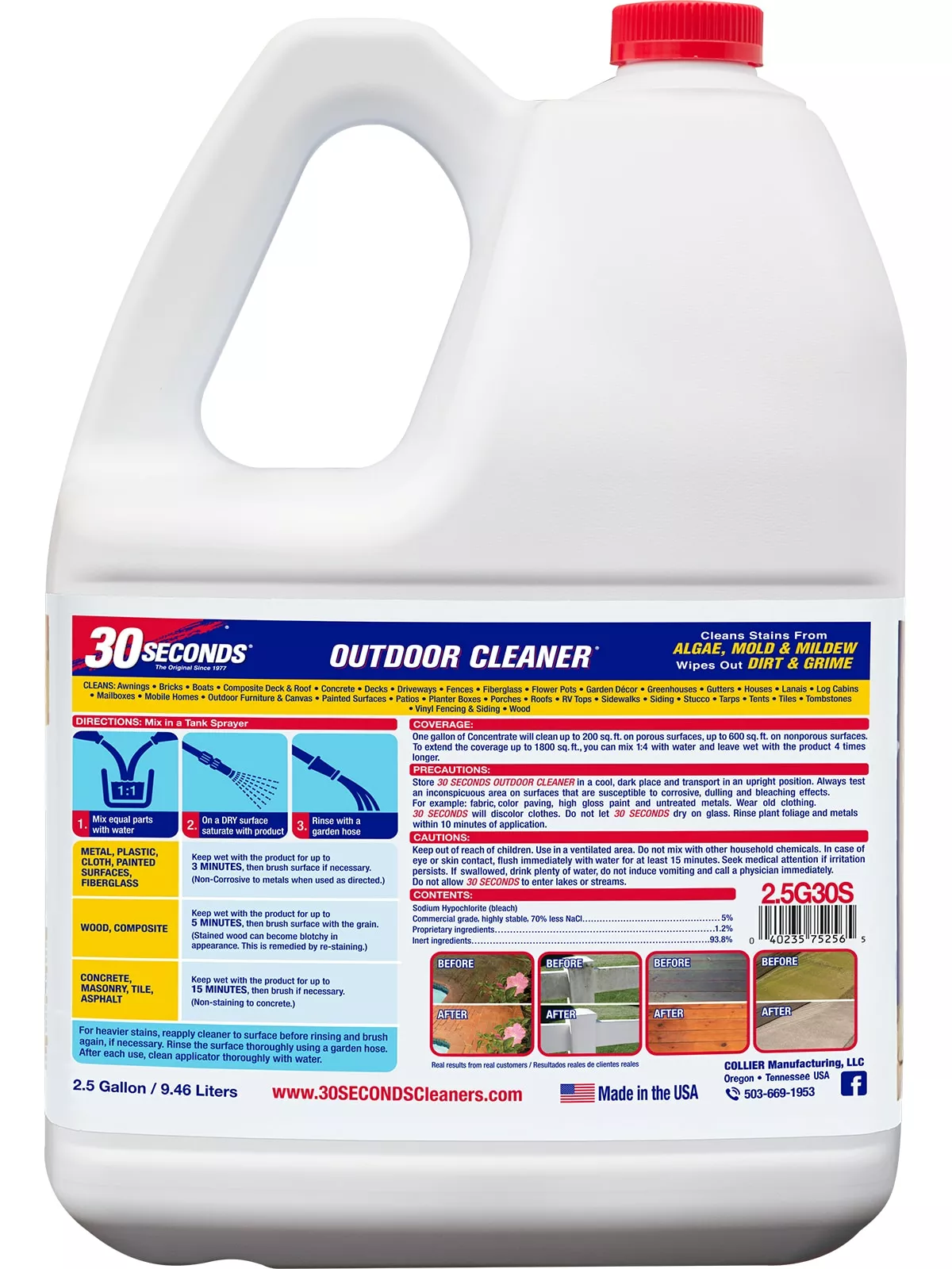 30 Seconds outdoor cleaner cleans algae, mold and mildew from anything outdoors. 30 Seconds Outdoor Cleaner can be used on a variety of surfaces; wood decks, concrete driveways, sidewalks, stucco, vinyl siding, brick walls, plastic outdoor furniture, you name it. If it’s outdoors and dirty from humidity and wet weather, 30 Seconds can clean it all. Simply spray on and hose off. It’s clean when you want it clean.