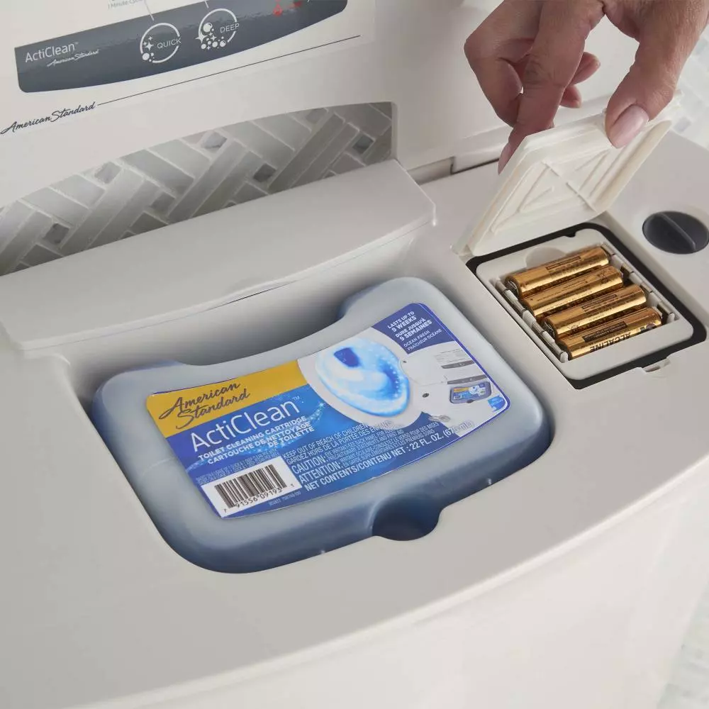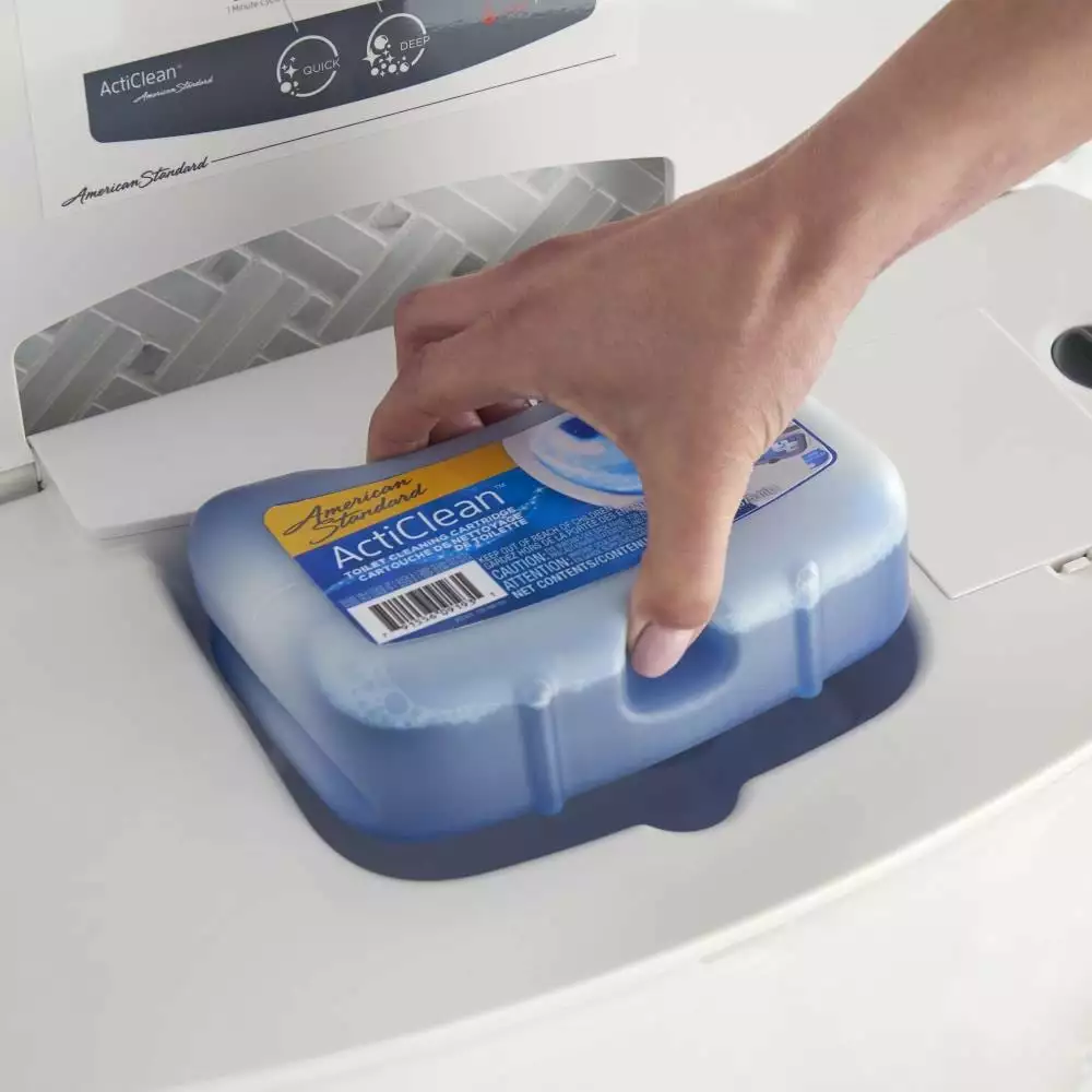 The ActiClean toilet features a cleaning system that cleans and removes stains with the powerful American Standard cleaning solution. If used as directed, each cartridge will last up to 9 weeks (based on a usage of 1 quick clean and 1 deep clean per week).