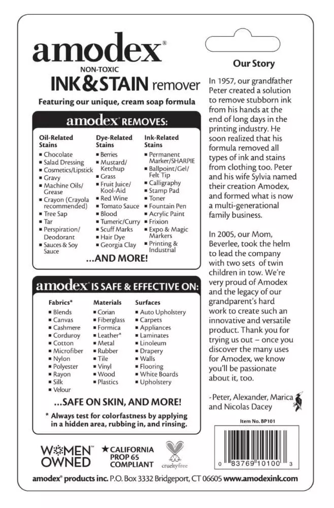 In 1957, our grandfather peter created a solution to remove stubborn ink from his hands at the end of long days in the printing industry. He soon realized that his formula removed all types of ink and stains from clothing, too. Peter and his wife Sylvia named their creation Amodex, and formed what is now a multi-generational family business. In 2005, our mom, Beverlee, took the helm to lead the company with two sets of twin children in tow. We’re very proud of Amodex and the legacy of our grandparent’s hard work to create such an innovative and versatile product. Thank you for trying us out – once you discover the many uses for Amodex, we know you’ll be passionate about it, too.
