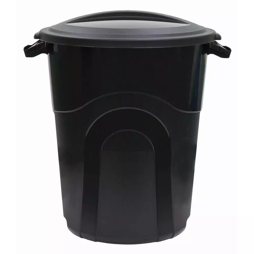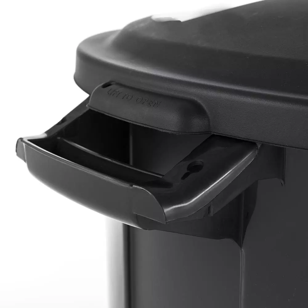 This trashcan holds up to 20 gallons of waste. It has a bag cinch to hold the trash bag in place. The durable pass-through handle allows for easy transporting. The click-lock lid keeps lid securely in place. It has pre drilled tether holes that allow the consumer to add plastic tie or rope to attach the lid to the can. There is a bottom hand groove for easier lifting and pouring. It is made in the USA.
