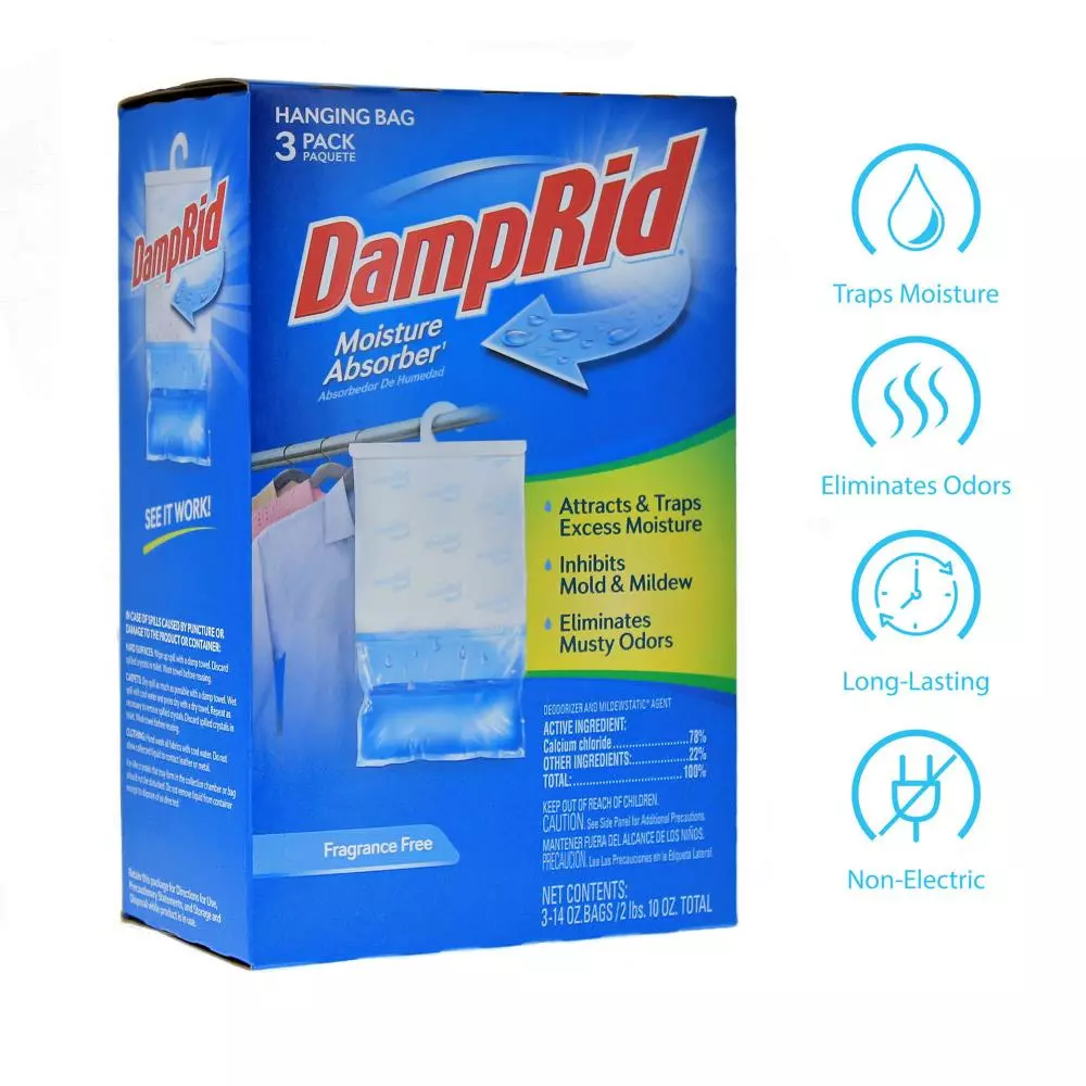- DampRid Fragrance Free Hanging Moisture Absorber attracts and traps excess moisture from the air, eliminating musty odors and inhibiting mold and mildew