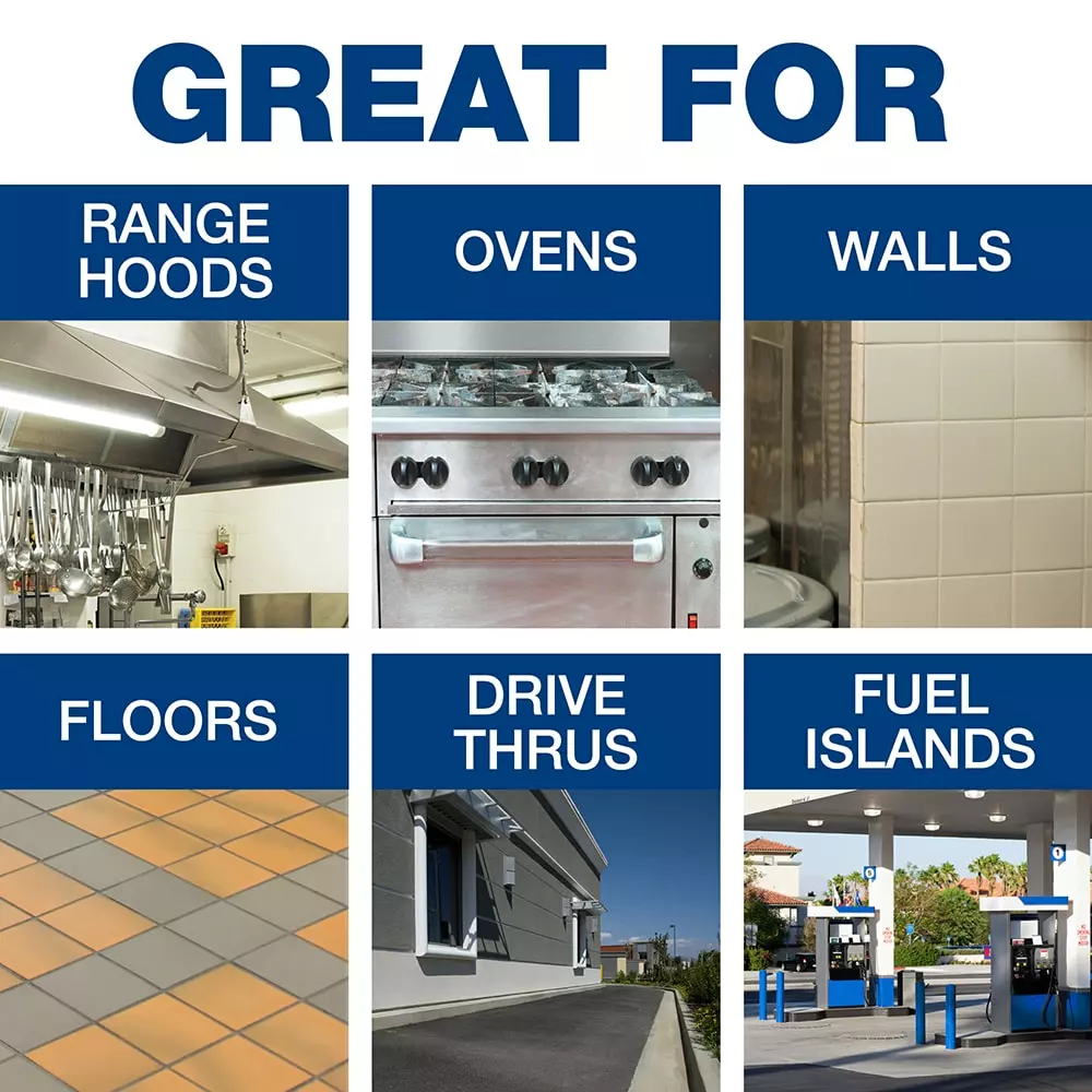 - Degreaser is great for tough buildup on surfaces, like range hoods, ovens, walls, floors, drive-thru pads and fuel islands