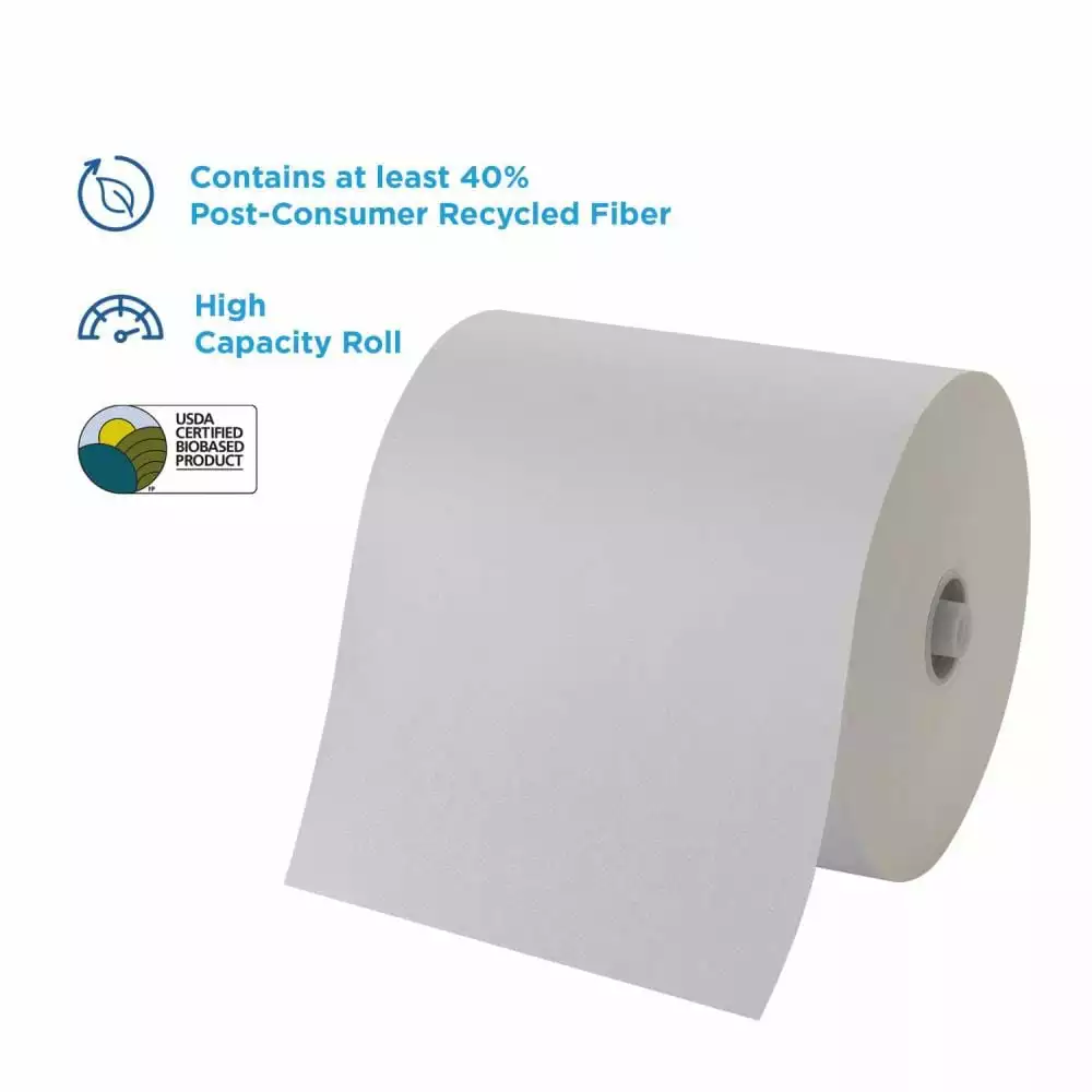 Long lasting rolls, long enough to stretch across the length of a football field 3 times before needing to be refilled. Part of the Pacific Blue Ultra family of paper towel dispensers and fit interchangeably into both the automated and mechanical (does not require batteries) dispensers. This roll paper towel option is an affordable alternative from the makers of the well-known enMotion paper towel products, for those who value efficiency. Gives restrooms, break rooms and workspaces a neat and clean look. The coordinating Pacific Blue Ultra paper towel dispensers provide one paper towel at a time, helping to lower waste and improve cleanliness by reducing the risk of cross-contamination. Dispensed paper towels are cleaner and more hygienic than stacked folded towels, and help cut down on maintenance. Unlike with folded towels, customers can’t grab stacks, so they’re less likely to end up all over the floor. Coordinating dispensers are built to handle heavy usage. Your restroom is a reflection of your business. And incredibly, one-half of all customer complaints are restroom related. All the more reason to put your best restroom forward. Towel/Wipe Type: Hardwound Roll Towel; Application: General Purpose; Material(s): Paper; Number of Plies: 1.