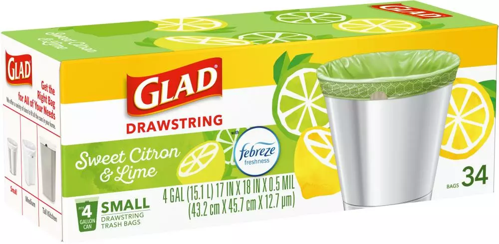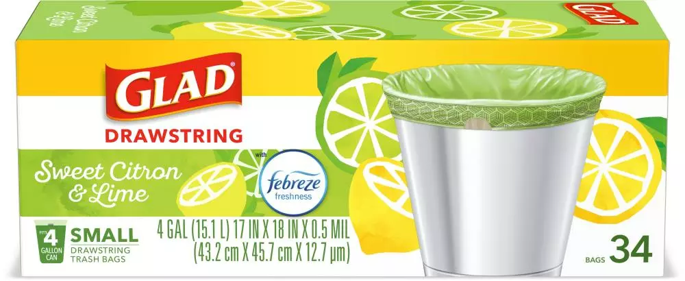 Fight nasty kitchen odors with Glad Small Drawstring Trash Bags and the steady release of Febreze Freshness in Sweet Citron and Lime scent. These green plastic trash bags with Febreze Freshness provide strength plus continuous odor neutralization to keep your whole house smelling fresh and clean. 4 gallon trash bags fit small size trash cans and are great for use throughout busy homes, and for seasonal cleaning like Spring cleaning and back to school. Take the trash to the curb with no fear of leaks and tears, and no frustration. The durable drawstring ensures a tight grip on the trash can to keep it in place, making garbage bags easy to lift, carry and toss away. Keep your kitchen smelling clean with the stretchable strength of Glad.