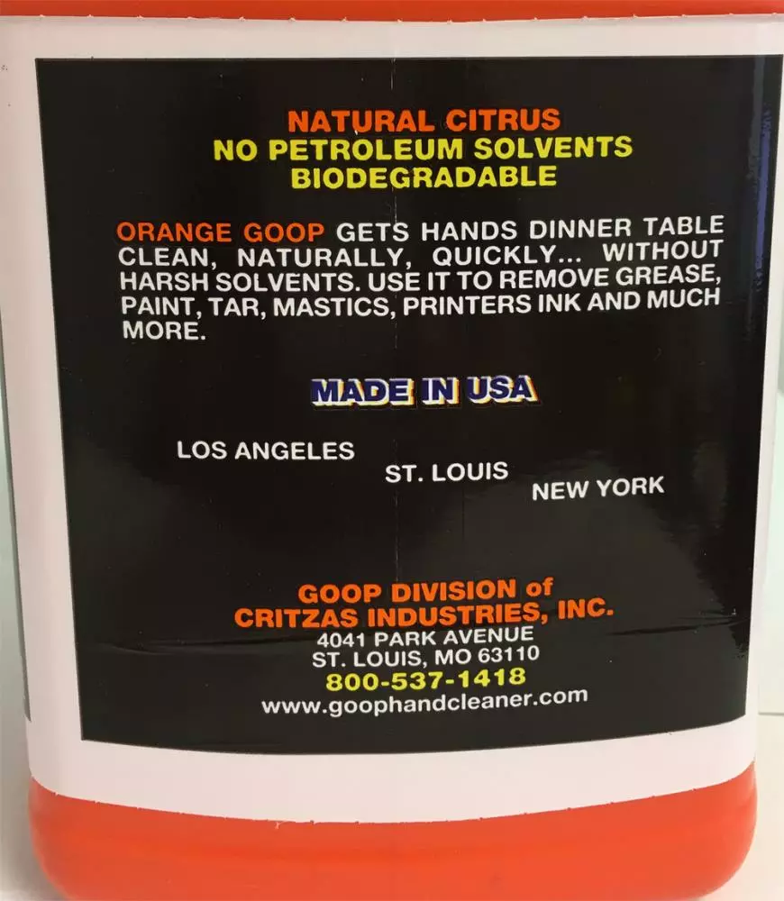 - Orange Goop liquid gel is a waterless hand cleaner that gets hands dinner table clean quickly, with the power of orange