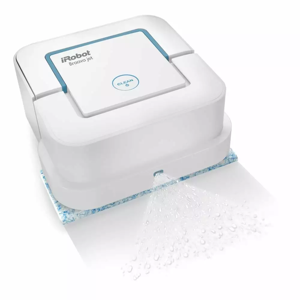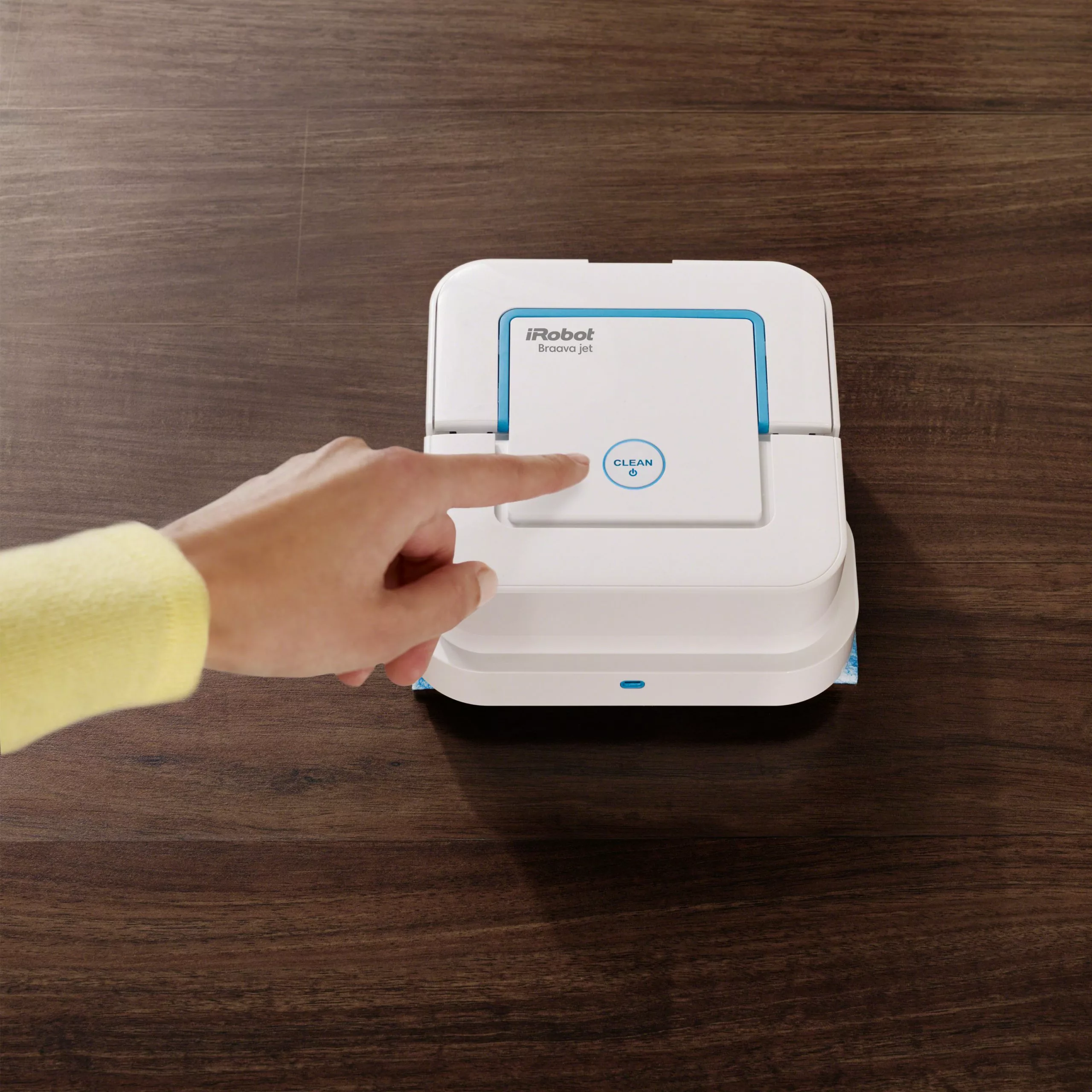 The iRobot Braava jet mopping robot delivers fresh, clean floors every day. With its compact, smart design and iAdapt 2.0 Navigation system, Braava jet mops and sweeps hard-to-reach places, like under kitchen cabinets and around toilets. Just attach a Braava jet cleaning pad and the robot automatically customizes cleaning based on pad type. In wet mopping and damp sweeping modes, the precision jet spray and vibrating cleaning head tackle dirt and stains. In dry sweeping mode, Braava jet traps and locks away dust, dirt, and pet hair. Braava jet cleans hard floors, including hardwood, tile, and stone.