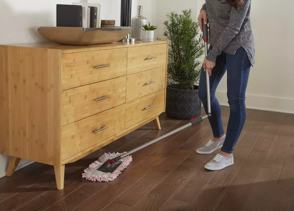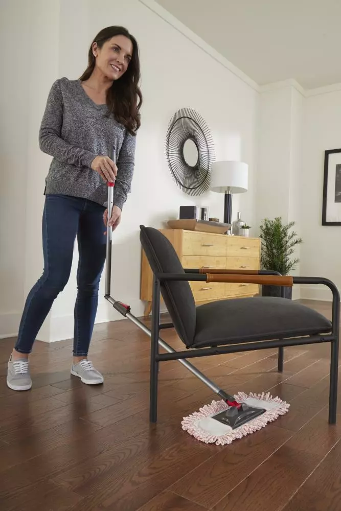 Efficient dust mop pad with long chenille fingers and low pile in the center to quickly trap dust and debris. Innovative, flexible head and handle to easily clean under furniture or along baseboards.