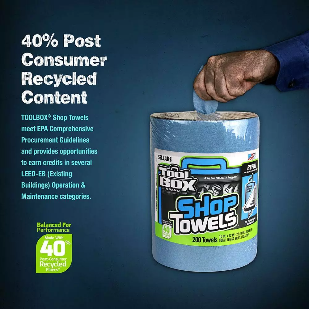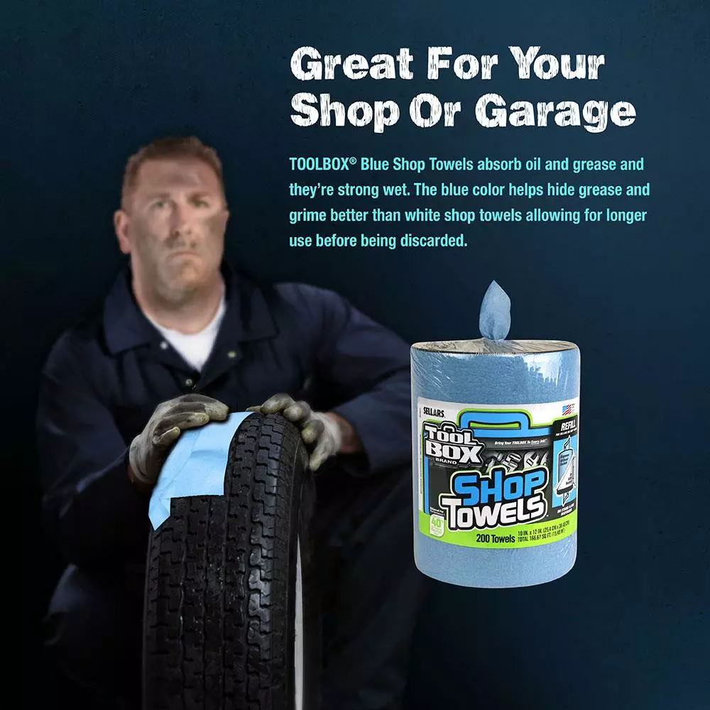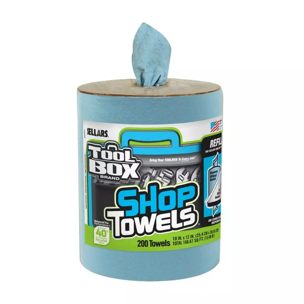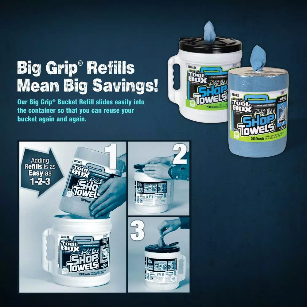 Use as a refill for the Blue Shop Towel Big Grip Bucket Dispenser or as a stand-alone center-pull blue shop towel dispenser. Blue shop towels help hide grease and grime better than white shop towels allowing for more use before being discarded. Center-pull towels are wrapped in plastic with a cardboard dispensing disk that allows for single sheet dispensing and also provides support for the container so that it will not collapse even when down to the last few sheets.