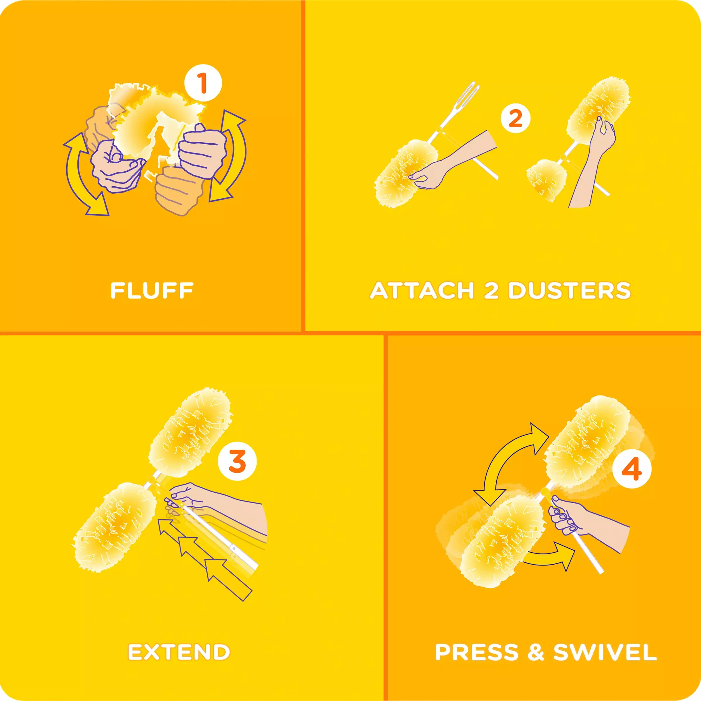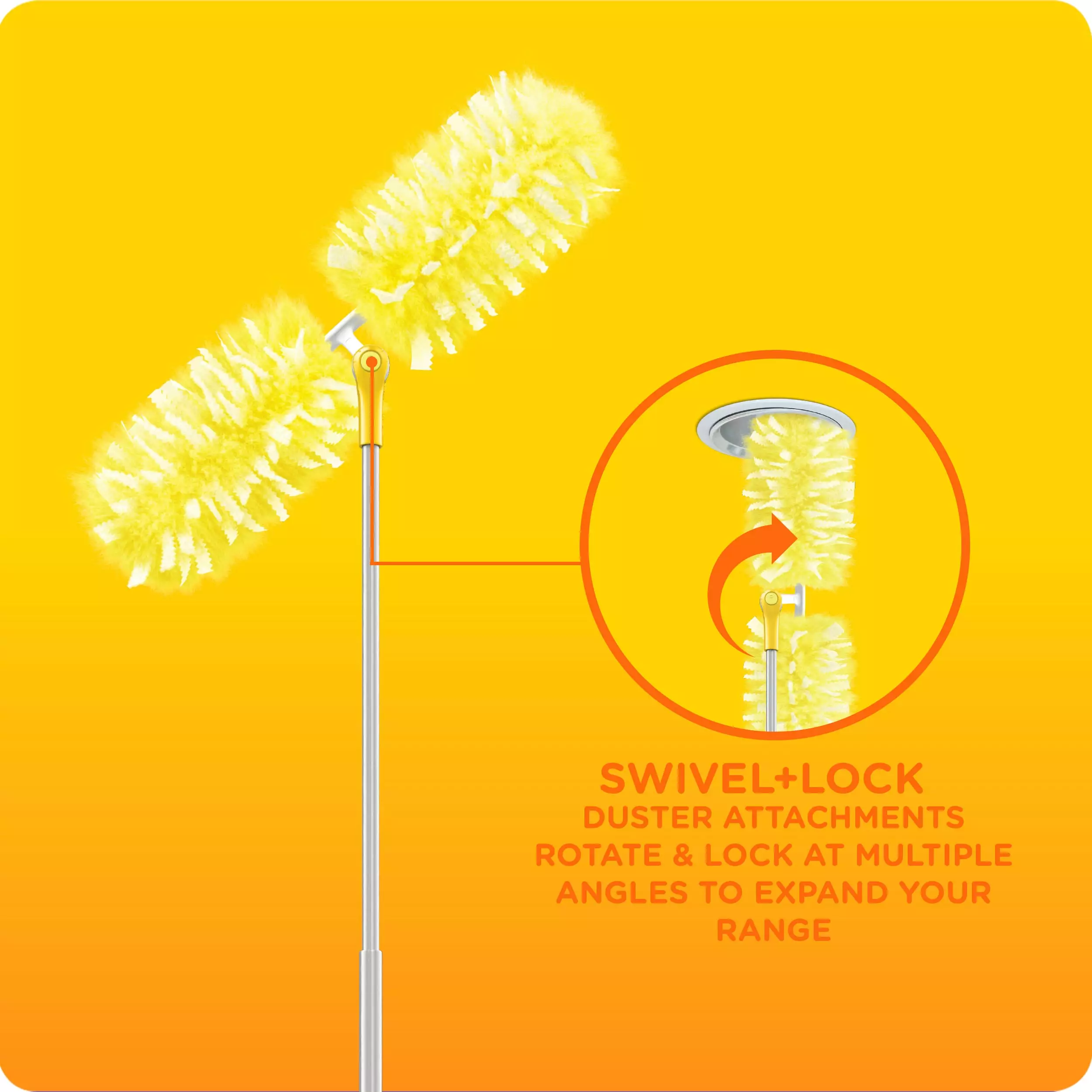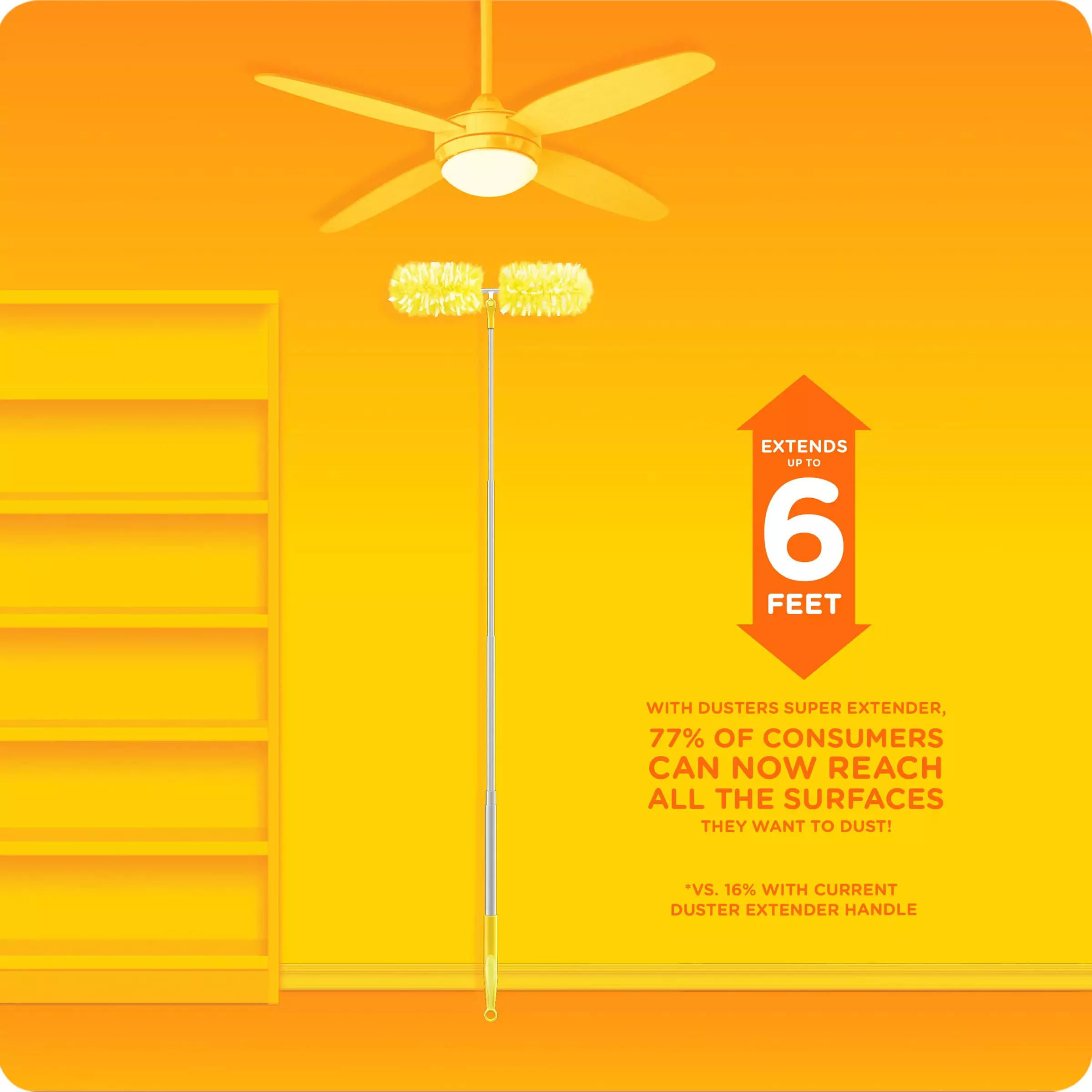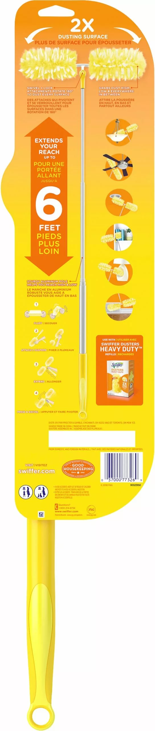 Heavy duty dusters super extender handle starter kit extends up to 6 feet allowing you to reach more areas of your home, especially hard to reach places. Trap + lock up to 3x more dust and allergens. Duster offers 360 degrees of specially coated fibers that grab onto dust and do not let go. They are uniquely designed to trap + lock dust from every direction. The unique swivel head pivots and locks into four different positions.