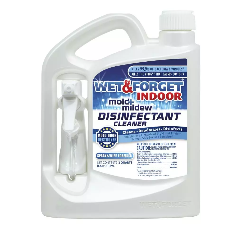 Wet and Forget Indoor Kills the Virus (SARS-Related Coronavirus 2) that causes COVID-19 on hard, non-porous, non-food surfaces. Effective against SARS-Related Coronavirus 2 SARS-CoV-2 in 3 minutes on hard, non-porous, non-food surfaces. Wet and Forget Indoor kills 99.9% of bacteria and viruses. Disinfect hard non-porous surfaces with Wet and Forget Indoor. Clean, disinfect and deodorize surfaces in one step. Wet and Forget Indoor doesn’t contain bleach or have any harsh fumes. As a disinfectant, Wet and Forget Indoor Mold + Mildew Disinfectant Cleaner kills: Pseudomonas aeruginosa, Salmonella enterica, Serratia marcescens, Human Coronavirus, lnfluenza Virus Type A/Hong Kong, SARS Associated Coronavirus cause of Severe Acute Respiratory Syndrome, SARS-Related Coronavirus 2 SARS-CoV-2 cause of COVID-19, Vaccinia (Pox Virus), Norwalk Virus (Norovirus), Rotavirus. Proven spot treatment soft surface sanitizer against Staphylococcus aureus and Enterobacter aerogenes.